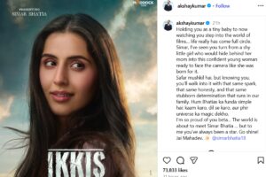 Ikkis: बॉलीवुड के सुपरस्टार अक्षय कुमार की भांजी सिमर भाटिया अब फिल्म इंडस्ट्री में कदम रख रही हैं. उनकी बड़ी फिल्म Ikkis रिलीज के लिए तैयार हैं और इस मौके पर अक्षय कुमार ने अपने इंस्टाग्राम अकाउंट पर भावुक संदेश शेयर किया. हाल ही में फिल्म का नया गाना ‘सितारे’, जिसे अरिजित सिंह ने गाया है, रिलीज हुआ. इस गाने के साथ ही फिल्म की प्रमोशनल यात्रा भी शुरू हो गई है. सोशल मीडिया पर फिल्म के कलाकारों के वीडियो वायरल हो रहे हैं, जिसमें वे अपने रोल और फिल्म के बारे में बातें कर रहे हैं.