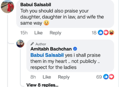दरअसल, अमिताभ बच्चन ने अपनी दो तसवीरें पोस्ट कि जिसमें फैंस उनसे मिलने जलसा आए थे. इसमें लिखा था, “हां, मैं अभिषेक की तारीफ करता हूं. तो?” जिसके बाद एक यूजर ने कमेंट में लिखा, “तो आपको भी अपनी बेटी, बहू, पत्नी की उसी तरह तारीफ करनी चाहिए.” इसपर रिप्लाई करते हुए बिग बी ने लिखा, “हां, मैं उन्हें दिल से सराहता हूं… लेकिन सबके सामने नहीं… उन महिलाओं के लिए सम्मान है.”