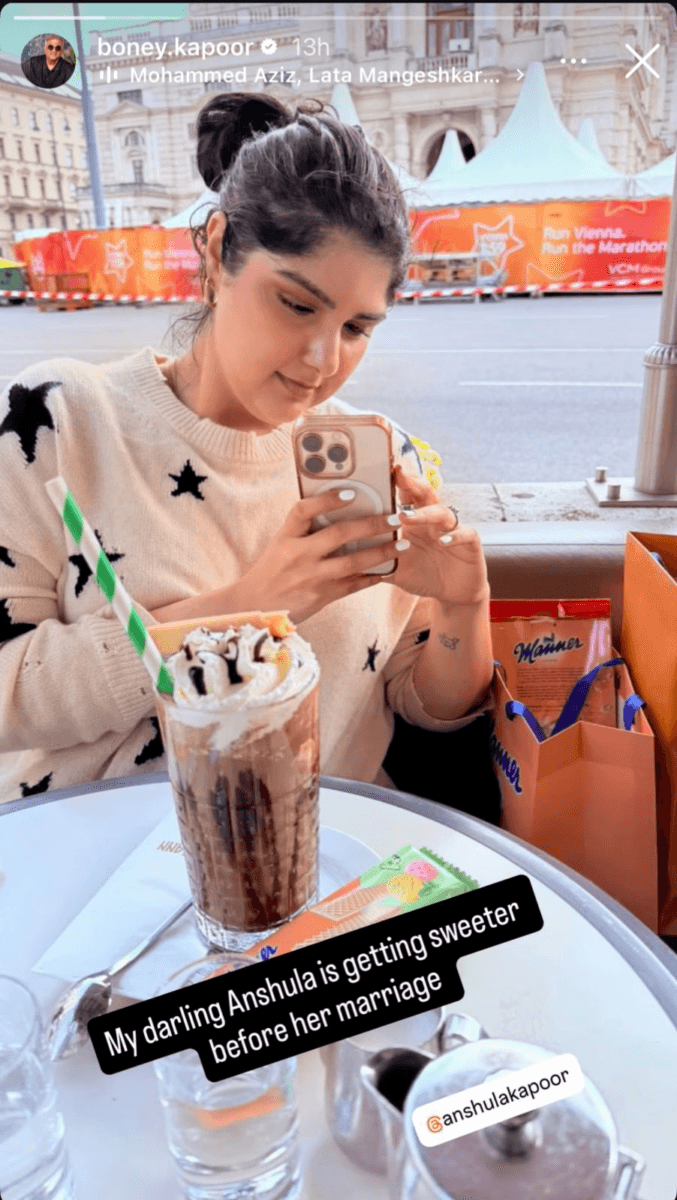 शादी के माहौल के बीच बोनी कपूर ने अपनी इंस्टा स्टोरी पर अंशुला की एक तस्वीर शेयर की, जिसमें वह कैफे में बैठी नजर आ रही हैं. इस तस्वीर के साथ उन्होंने लिखा कि उनकी प्यारी अंशुला शादी से पहले और भी ज्यादा प्यारी होती जा रही हैं. पिता का यह भावुक संदेश फैंस को काफी पसंद आ रहा है.