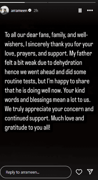 एआर रहमान के हॉस्पिटल भर्ती होने के बाद उनके बेटे एआर अमीन ने अपने इंस्टाग्राम पर उनके तबियत को लेकर अपडेट दिया. उन्होंने लिखा, ‘मेरे पिता डिहाइड्रेशन के कारण कमजोर हो गए थे, इसीलिए उनके जांच के लिए उन्हें हॉस्पिटल ले जाया गया था. मुझे यह बताते हुए खुशी है कि मेरे पिता की तबीयत अब बिलकुल ठीक है. हमारे सभी फैंस, फैमिली और शुभचिंतकों का, उनके प्यार और सपोर्ट के लिए मैं धन्यवाद करता हूं. आपका आशीर्वाद हमारे लिए बहुत मायने रखता है. हम सच में आपकी चिंता और सपोर्ट की प्रशंसा करते है. आप सभी को ढेर सारा प्यार और धन्यवाद.’