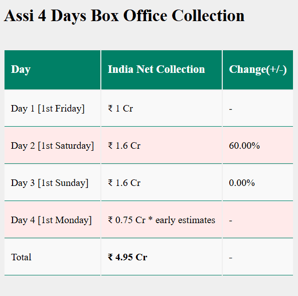 अब अगर चार दिनों की कुल कमाई देखें तो ‘अस्सी‘ ने लगभग 4.95 करोड़ रुपये नेट और करीब 5.93 करोड़ रुपये ग्रॉस कलेक्शन कर लिया है. यह कोई बहुत बड़ा रिकॉर्ड नहीं है, लेकिन फिल्म ने पूरी तरह से रफ्तार भी नहीं खोई है. शुरुआत के हिसाब से इसे औसत प्रदर्शन कहा जा सकता है.