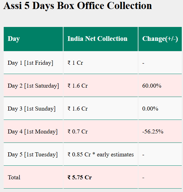 Sacnilk की रिपोर्ट के मुताबिक पांचवे दिन यानी मंगलवार को फिल्म ‘अस्सी’ ने भारत बॉक्स ऑफिस पर करीब 0.85 करोड़ रुपये की नेट कारोबार की है. वहीं फिल्म का टोटल कलेक्शन 5.75 करोड़ रुपये हुआ है. वीकडे होने की वजह से फिल्म की कमाई में गिरावट साफ दिखी. शुरुआती दिनों में भी फिल्म की कमाई कुछ खास नहीं रही थी, और पांचवें दिन का कलेक्शन यह दिखाता है कि फिल्म की पकड़ अभी तक मजबूत नहीं बन पाई है.