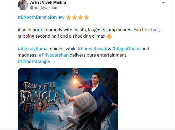 एक्स पर गिरिश नाम के यूजर ने ‘भूत बंगला’ को 5 रेटिंग देते हुए लिखा, अक्षय कुमार, कॉमेडी के किंग, वापस आ गए हैं. हॉरर और कॉमेडी का मजेदार बैलेंस! प्रियदर्शन का खास अंदाज और अक्षय कुमार की कॉमेडी इसे पूरी तरह एंटरटेनिंग बनाता है.” विवेक मिश्रा नाम के यूजर ने लिखा, ट्विस्ट, हंसी और अचानक डराने वाले पलों से भरी एक जबरदस्त हॉरर कॉमेडी. पहला हाफ मजेदार, दूसरा हाफ रोमांचक और क्लाइमेक्स चौंकाने वाला. अक्षय कुमार ने शानदार काम किया है. वहीं परेश रावल और राजपाल यादव ने इसमें और भी ज्यादा पागलपन भर दिया है. प्रियदर्शन ने दर्शकों को भरपूर मनोरंजन दिया है.
