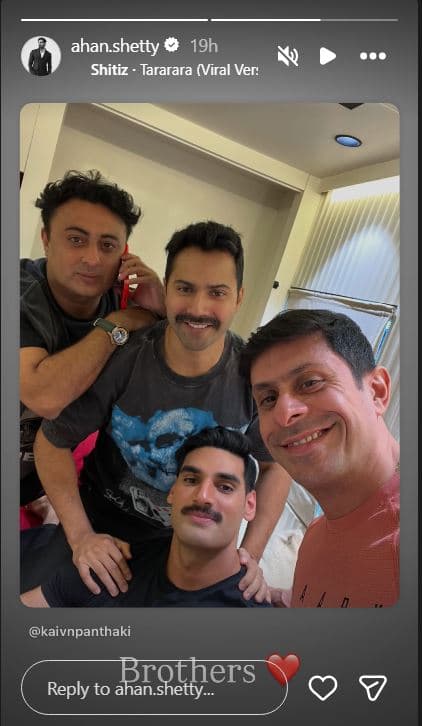 अहान शेट्टी ने अपनी इंस्टाग्राम स्टोरीज पर बॉर्डर 2 के सेट से वरुण धवन संग एक तसवीर शेयर की. जिसके कैप्शन में उन्होने लिखा, ”भाई.” फिलहाल, टीम अगले शेड्यूल के लिए पंजाब में है. शूटिंग जोर-शोर से चल रही है. दिलजीत दोसांझ भी फिल्म का हिस्सा हैं और अक्सर बीटीएस वीडियो और तस्वीरें शेयर करते रहते हैं.