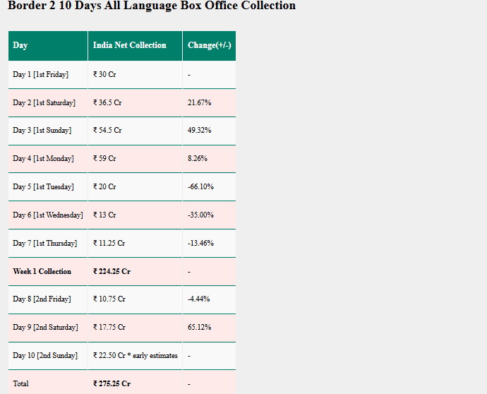ट्रेड ट्रैकिंग वेबसाइट Sacnilk के मुताबिक, बॉर्डर 2 ने रिलीज के 10वें दिन यानी दूसरे रविवार को करीब 22.50 करोड़ रुपये की कमाई की. फिल्म ने अपना पहला हफ्ता 224 करोड़ रुपये के शानदार कलेक्शन के साथ पूरा किया था. इसके बाद दूसरे वीकेंड में फिल्म ने शुक्रवार को 10.75 करोड़, शनिवार को 17.75 करोड़ और रविवार को 22.50 करोड़ कमाए. इस तरह 10 दिनों में फिल्म का कुल नेट कलेक्शन 275.25 करोड़ रुपये तक पहुंच गया है.