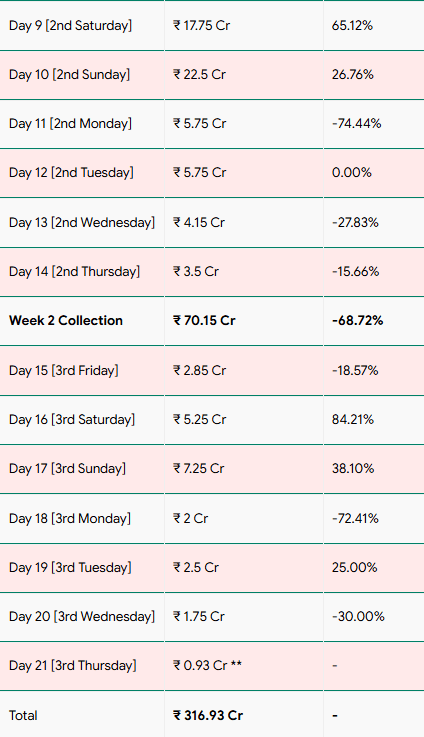 सैकनिल्क के आंकड़ों के मुताबिक, फिल्म ने पहले हफ्ते में शानदार 224.25 करोड़ रुपये की कमाई की थी. दूसरे हफ्ते में रफ्तार थोड़ी धीमी जरूर पड़ी, लेकिन फिर भी 70.15 करोड़ रुपये बटोर लिए. तीसरे हफ्ते में एंट्री के बाद रोजाना की कमाई घटती-बढ़ती रही. 15वें दिन 2.85 करोड़, 16वें दिन 5.25 करोड़, 17वें दिन 7.25 करोड़ और 18वें दिन 2 करोड़ रुपये का कलेक्शन हुआ. 19वें दिन फिल्म ने 2.5 करोड़ और 20वें दिन 1.75 करोड़ रुपये जोड़े. इसी के साथ 20 दिनों में भारत में फिल्म का कुल नेट कलेक्शन 316 करोड़ रुपये तक पहुंच गया है.
