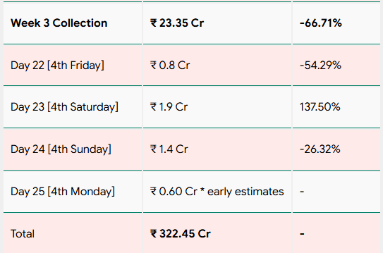 Sacnilk के मुताबिक, फिल्म ने 25वें दिन करीब 60 लाख रुपये का कलेक्शन किया है. इससे पहले रविवार को फिल्म ने 1.4 करोड़ के आसपास कमाई की थी, लेकिन वीकडे शुरू होते ही इसकी रफ्तार धीमी पड़ गई. हालांकि इसके बावजूद फिल्म सिनेमाघरों में अपनी पकड़ बनाए रखने में सफल रही है.