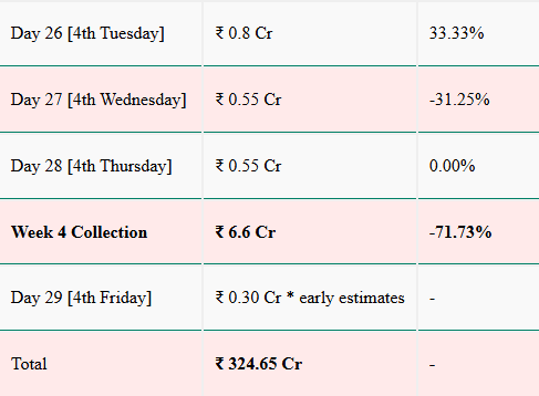 सैकनिल्क की शुरुआती रिपोर्ट्स के मुताबिक, फिल्म बॉर्डर 2 ने रिलीज के 29वें दिन यानी चौथे शुक्रवार को करीब 0.30 करोड़ रुपए की कमाई की है. लंबे समय से सिनेमाघरों में चल रही फिल्म के लिए यह कलेक्शन स्थिर प्रदर्शन को दिखाता है. भले ही अब कमाई लाखों में सिमट गई हो, लेकिन इतना लंबा रन और लगातार आ रही कमाई इस बात का संकेत है कि दर्शकों का कनेक्शन फिल्म से अभी भी बना हुआ है और वीकेंड पर इसमें हल्की बढ़त देखने को मिल सकती है.