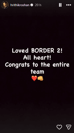 मंगलवार शाम ऋतिक ने अपने ऑफिशियल इंस्टाग्राम अकाउंट पर पोस्ट शेयर करते हुए लिखा, “बॉर्डर 2 बहुत पसंद आई, दिल को छू गई. पूरी टीम को बधाई.”