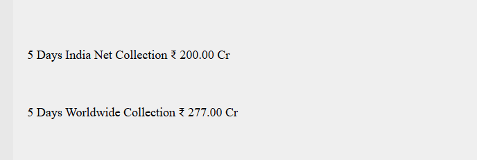 फिल्म की शुरुआत धमाकेदार रही. इसने अपने पहले चार दिनों 180 करोड़ रुपये का कलेक्शन कर लिया है. गणतंत्र दिवस के मौके पर सनी देओल की फिल्म ने 59 करोड़ की कमाई कर ली है. मंगलवार और बुधवार को फिल्म के कलेक्शन में थोड़ी गिरावट जरूर देखी गई. भारत में इसकी कुल घरेलू कमाई 213 करोड़ हो गई है. sacnilk की रिपोर्ट के अनुसार, फिल्म ने वर्ल्डवाइड पांच दिनों में 277 करोड़ का कलेक्शन कर लिया है. अब उम्मीद है फिल्म वीकेंड के अंत तक 300 करोड़ का आंकड़ा पार कर लेगी. अपनी इस जबरदस्त कमाई के साथ ‘बॉर्डर 2’ ने प्रभास की फिल्म ‘द राजा साब’ (207 करोड़)को पीछे छोड़ दिया है.