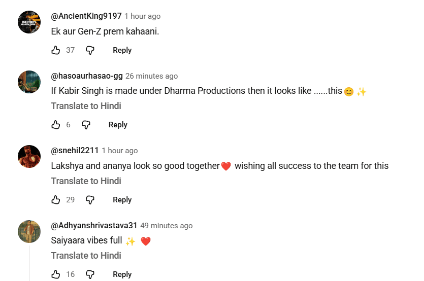 यूट्यूब पर टीजर का रिलीज होते ही फैंस कमेंट्स सेक्शन में जमकर रिएक्शन दे रहे हैं. एक यूजर ने लिखा, एक और Gen-z प्रेम कहानी. दूसरे यूजर ने लिखा, लक्ष्य और अनन्या एक साथ अच्छे दिख रहे हैं. तीसरे यूजर ने लिखा, सैंयारा वाइब्स फूल.