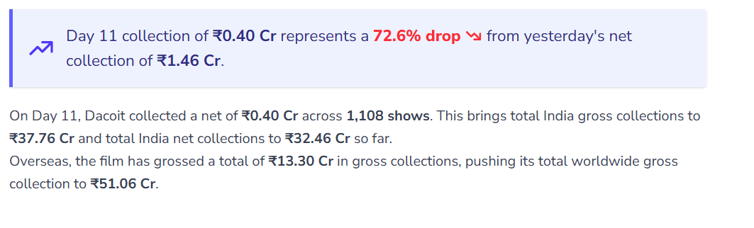 Dacoit Box Office Collection Day 11: अदिवि शेष और मृणाल ठाकुर की फिल्म ‘डकैत’ के लिए दूसरा हफ्ता मुश्किलों से भरा साबित हो रहा है. पहले हफ्ते में शानदार पकड़ बनाने के बाद, अब फिल्म की कमाई में जबरदस्त गिरावट देखने को मिल रहा है. हालांकि, फिल्म ने दुनिया भर में 50 करोड़ रुपये का आंकड़ा पार कर लिया है, लेकिन सोमवार के कलेक्शन ने मेकर्स की चिंता बढ़ा दी. Sacnilk की रिपोर्ट के अनुसार ‘डकैत’ ने अपने 11वें दिन बॉक्स ऑफिस पर 0.40 करोड़ रुपये की कमाई की है. रविवार को फिल्म ने 1 करोड़ से ज्यादा का कारोबार किया था, लेकिन सोमवार आते ही इसकी कमाई काफी कम हुई है. यह फिल्म की अब तक की सबसे बड़ी सिंगल-डे गिरावट मानी जा रही है. वहीं फिल्म का भारतीय नेट कलेक्शन 32.46 करोड़ रुपये हुआ है.
