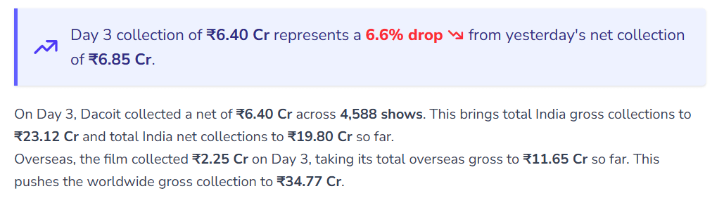 Sacnilk की रिपोर्ट के अनुसार फिल्म को भारत के साथ-साथ विदेशों में भी पसंद किया जा रहा है. ‘डकैत’ ने विदेश में तीसरे दिन 2.25 करोड़ रुपये का कारोबार किया है. जबकि इसकी ओवरसीज ग्रॉस कलेक्शन 11.65 करोड़ रुपये हुआ है और दुनिया भर में कुल कमाई 34.77 करोड़ रुपये पहुंच गया है.