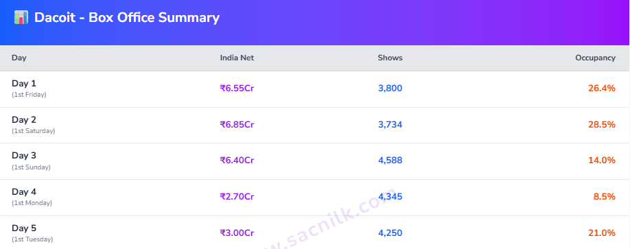 Dacoit Box Office Collection Day 5: Adivi Sesh और Mrunal Thakur स्टारर फिल्म Dacoit बॉक्स ऑफिस पर उम्मीद के मुताबिक प्रदर्शन नहीं कर पा रही है. रिलीज के पांचवें दिन फिल्म की कमाई में हल्का सुधार जरूर देखने को मिला, लेकिन कुल मिलाकर इसकी रफ्तार अभी भी धीमी बनी हुई है.