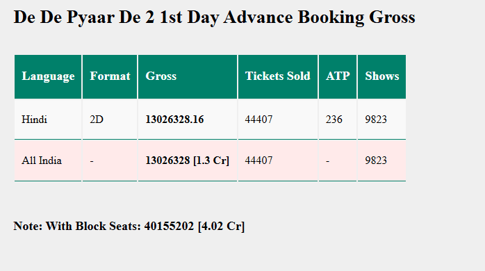 फिल्म ‘दे दे प्यार दे 2‘ ने अब तक कितनी टिकट बेच ली है, इसके बारे में आपको बताते हैं. sacnilk की एक रिपोर्ट के अनुसार, फिल्म ने अब तक 44407 टिकट कुल 9823 शोज से बेच लिए. जिसके बाद फिल्म की कमाई अभी तक 1.3 करोड़ रुपये हो गई है. ब्लॉक सीट्स मिलाकर फिल्म ने करीब 4.02 करोड़ रुपये का कलेक्शन किया है. हालांकि ये नंबर्स और बढ़ेंगे.