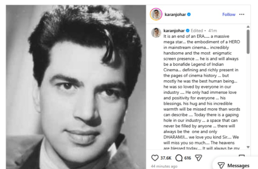 करण जौहर ने इंस्टाग्राम पर धरम जी की फोटो पोस्ट करते हुए इंस्टाग्राम पर लिखा कि ''यह एक युग का अंत है... एक विशाल मेगा स्टार... मुख्यधारा के सिनेमा में एक हीरो का अवतार... अविश्वसनीय रूप से सुंदर और सबसे रहस्यमय स्क्रीन उपस्थिति... वह भारतीय सिनेमा के एक वास्तविक लीजेंड हैं और हमेशा रहेंगे... सिनेमा के इतिहास के पन्नों में परिभाषित और समृद्ध रूप से मौजूद हैं... लेकिन सबसे बढ़कर वह सबसे अच्छे इंसान थे... हमारी इंडस्ट्री में हर कोई उन्हें बहुत प्यार करता था... उनके पास सभी के लिए असीम प्यार और सकारात्मकता थी... उनका आशीर्वाद, उनका आलिंगन और उनकी अविश्वसनीय गर्मजोशी शब्दों से ज़्यादा याद आएगी... आज हमारी इंडस्ट्री में एक बड़ा खालीपन है... एक ऐसा स्थान जो कभी किसी के द्वारा भरा नहीं जा सकता... हमेशा एक और केवल धरमजी रहेंगे... हम आपसे प्यार करते हैं सर... हम आपको बहुत याद करेंगे... आज स्वर्ग धन्य है... आपके साथ काम करना हमेशा मेरे लिए आशीर्वाद रहेगा... और मेरा दिल सम्मान, श्रद्धा और प्रेम के साथ कहता है... अभी ना जाओ छोड़के... के दिल अभी भरा नहीं... ओम शांति🕉️ ''