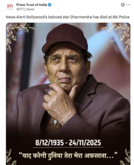 Dharmendra Health Live: PTI ने लिखा- बॉलीवुड के चहेते स्टार धर्मेंद्र का 89 साल की उम्र में निधन: पुलिस