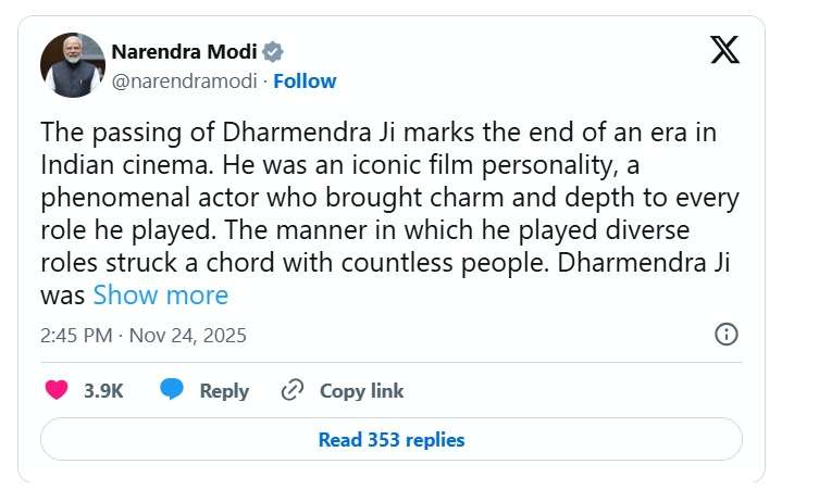 PM मोदी ने धर्मेंद्र को श्रद्धांजलि देते हुए एक्स पर लिखा कि धर्मेंद्र जी का निधन भारतीय सिनेमा के एक युग का अंत है. वे एक प्रतिष्ठित फिल्मी हस्ती, एक अद्भुत अभिनेता थे जिन्होंने अपनी हर भूमिका में आकर्षण और गहराई भर दी. जिस तरह से उन्होंने विविध भूमिकाएं निभाईं, उसने अनगिनत लोगों के दिलों को छुआ. धर्मेंद्र जी अपनी सादगी, विनम्रता और गर्मजोशी के लिए भी समान रूप से प्रशंसित थे. इस दुखद घड़ी में, मेरी संवेदनाएँ उनके परिवार, मित्रों और असंख्य प्रशंसकों के साथ हैं. ॐ शांति