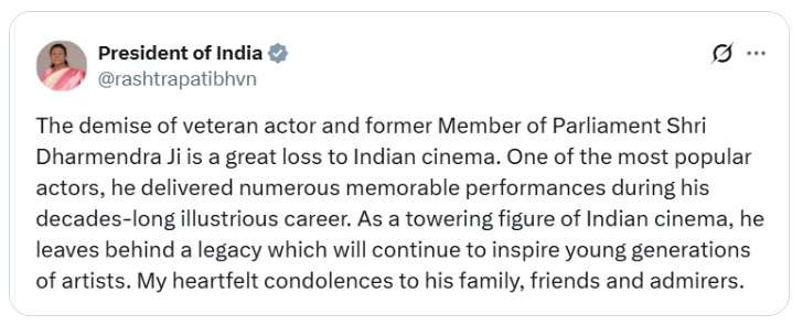 राष्ट्रपति द्रौपदी मुर्मू ने धर्मेंद्र के निधन पर शोक व्यक्त किया. उन्होंने एक्स पोस्ट में लिखा: "दिग्गज अभिनेता और पूर्व सांसद श्री धर्मेंद्र जी का निधन भारतीय सिनेमा के लिए एक बड़ी क्षति है. सबसे लोकप्रिय अभिनेताओं में से एक, उन्होंने अपने दशकों लंबे शानदार करियर में कई यादगार प्रस्तुतियां दीं. भारतीय सिनेमा की एक प्रमुख हस्ती के रूप में, वे अपने पीछे एक ऐसी विरासत छोड़ गए हैं जो कलाकारों की युवा पीढ़ियों को प्रेरित करती रहेगी. उनके परिवार, मित्रों और प्रशंसकों के प्रति मेरी हार्दिक संवेदना."