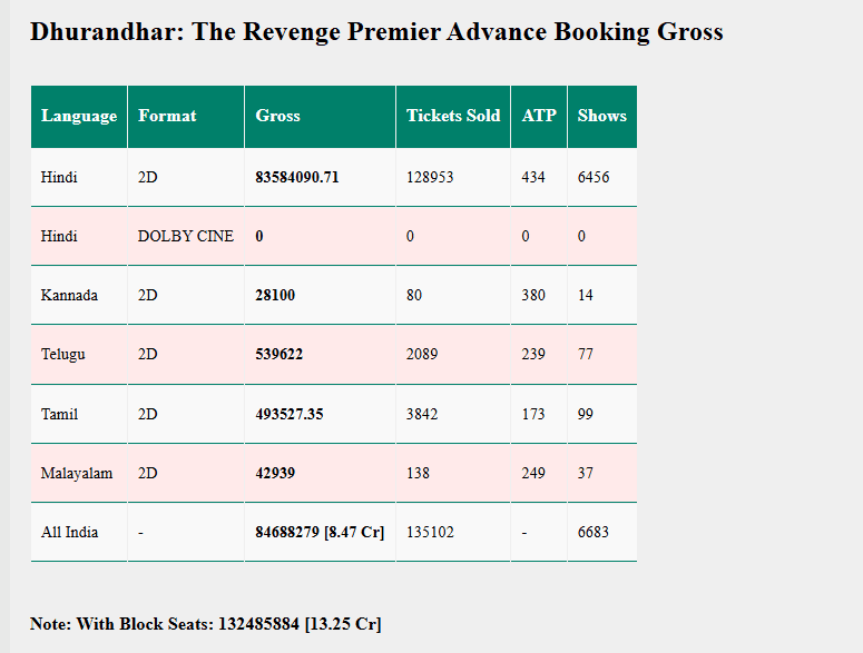 ट्रेड वेबसाइट Sacnilk की रिपोर्ट के मुताबिक, फिल्म ‘धुरंधर 2‘ के कुल 6684 शो तय किए गए हैं, जिनमें से 6456 शो हिंदी भाषा में हैं. हिंदी वर्जन के लिए ही करीब 1 लाख 35 हजार टिकट खरीदे जा चुके हैं. अगर ब्लॉक सीट्स को भी जोड़ा जाए तो फिल्म की एडवांस कमाई करीब 13.25 करोड़ रुपये तक पहुंच जाती है. इन आंकड़ों से साफ है कि रिलीज से पहले ही फिल्म को दर्शकों का अच्छा रिस्पॉन्स मिल रहा है.