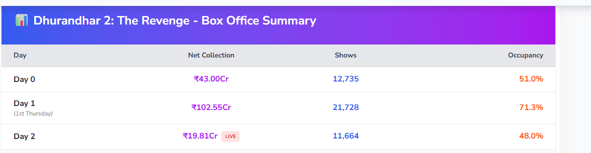 sacnilk की एक रिपोर्ट के अनुसार, ‘धुरंधर: द रिवेंज’ ने दूसरे दिन 1 बजे तक 19.81 करोड़ रुपये का कलेक्शन कर लिया है. रात के शोज आने के बाद फिल्म की टोटल कमाई आएगी. फिलहाल टोटल कमाई मूवी ने अभी 165.36 करोड़ रुपये का कर लिया है. ग्रास कलेक्शन की बात करें तो फिल्म ने 196.01 करोड़ रुपये का बिजनेस किया है. वीकेंड पर फिल्म की कमाई डबल होने की पूरी उम्मीद है.