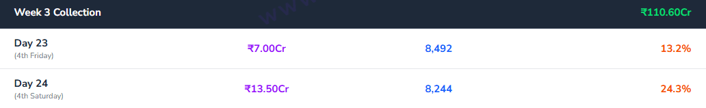 Sacnilk के रिपोर्ट के मुताबिक, फिल्म ने अपने 24वें दिन यानी चौथे शनिवार को करीब 13.50 करोड़ रुपये की कमाई की है. यह आंकड़ा पिछले दिन के मुकाबले लगभग दोगुना है, क्योंकि शुक्रवार को फिल्म ने करीब 7 करोड़ रुपये का कलेक्शन किया था. वीकेंड आते ही फिल्म ने फिर से रफ्तार पकड़ ली है.