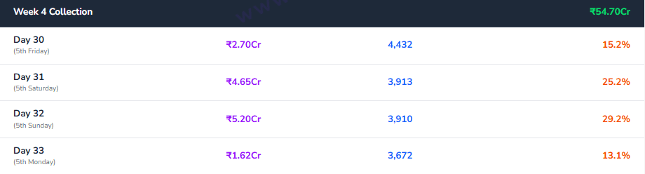 Sacnilk के मुताबिक, फिल्म ने अपने 33वें दिन यानी पांचवें सोमवार को महज 1.62 करोड़ रुपये का नेट कलेक्शन किया. रविवार के 5.20 करोड़ रुपये के मुकाबले यह करीब 68.8% की गिरावट है. इतने बड़े ड्रॉप ने साफ कर दिया है कि फिल्म की पकड़ अब दर्शकों पर कमजोर पड़ रही है.