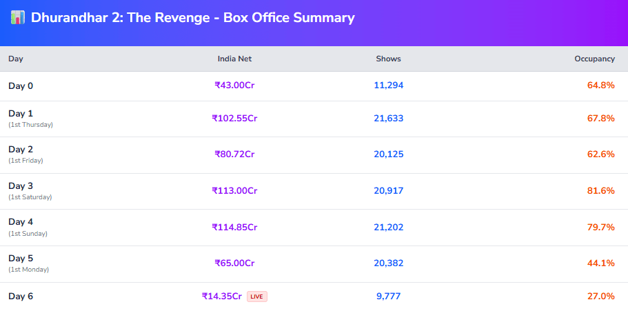 फिल्म की ऑक्यूपेंसी भी काफी मजबूत बनी हुई है. पांचवें दिन दोपहर तक करीब 25 प्रतिशत ऑक्यूपेंसी दर्ज की गई, जो वीकडेज के लिहाज से अच्छा संकेत माना जा रहा है. उम्मीद है कि शाम के शोज में दर्शकों की संख्या और बढ़ेगी.