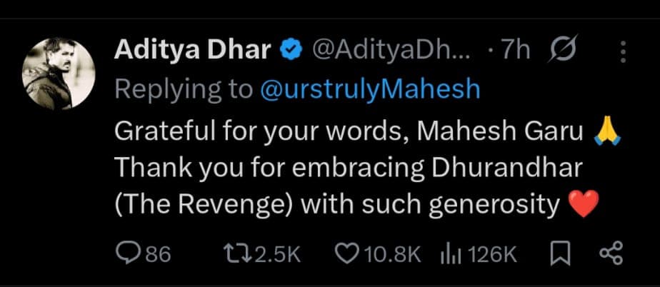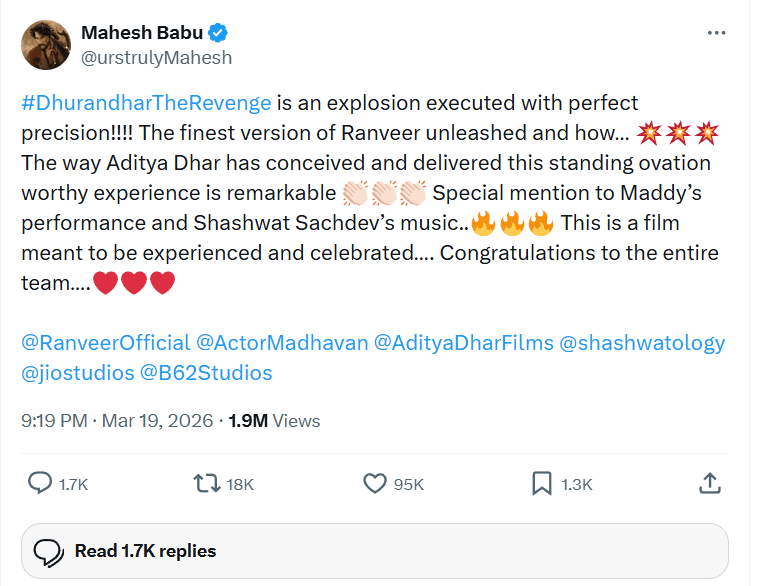 आदित्य धर ने जिस तरह इस फिल्म को सोचा और पेश किया है, वो सच में काबिले-तारीफ है और स्टैंडिंग ओवेशन के लायक है”. उन्होंने आगे लिखा “माधवन (मैडी) की एक्टिंग खास तौर पर बहुत अच्छी लगी और शाश्वत सचदेव का म्यूजिक भी शानदार है. यह एक ऐसी फिल्म है जिसे देखना और सेलिब्रेट करना चाहिए. पूरी टीम को बधाई.’ महेश बाबू की इस तारीफ पर डायरेक्टर आदित्य धर ने जवाब देते हुए लिखा, “आपके शब्दों के लिए दिल से धन्यवाद, महेश गरु आपने जिस प्यार से धुरंधर (द रिवेंज) को सराहा, उसके लिए बहुत आभारी हूं”