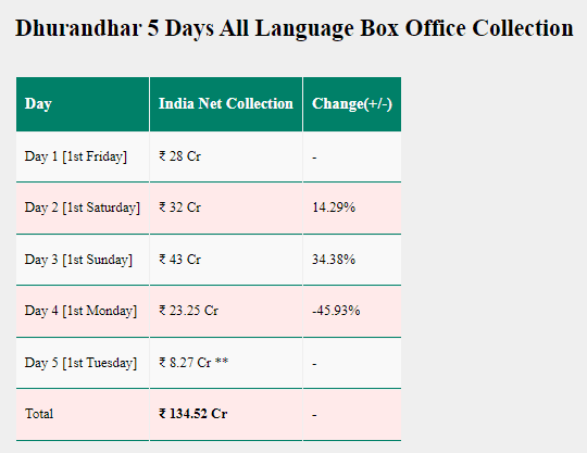 फिल्म ने महज 4 दिनों में 100 करोड़ का आंकड़ा पार कर लिया था. अब Sacnilk की अर्ली रिपोर्ट के अनुसार, पांचवें दिन दोपहर 4 बजे तक फिल्म ने भारत में 8.27 करोड़ रुपये का कलेक्शन किया. जिसके बाद कुल नेट कलेक्शन अब 134.52 करोड़ रुपये तक पहुंच गया है और नाईट शोज के बाद यह और बढ़ने की उम्मीद है.