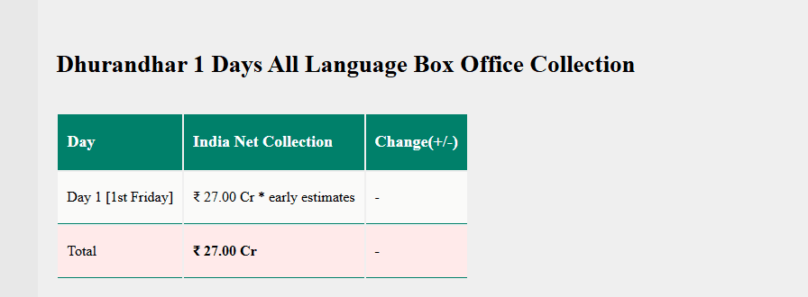 Dhurandhar Box Office Records: स्पाई थ्रिलर फिल्म 'धुरंधर' ने बॉक्स ऑफिस पर गदर मचा दिया. फिल्म ने ओपनिंग डे पर 27 करोड़ रुपये कमाए. इस बड़े आकंड़े के साथ इसने सैयारा, थामा, तेरे इश्क में का रिकॉर्ड तोड़ दिया. चलिए आपको पहले दिन का रिपोर्ट कार्ड बताते हैं.