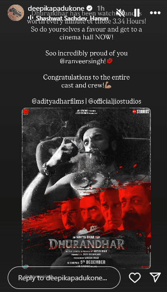 फिल्म देखने के बाद दीपिका ने अपनी इंस्टाग्राम स्टोरी पर एक खास नोट लिखा, “धुरंधर देख ली है और यह 3.36 घंटे का हर मिनट देखने लायक है. खुद पर एहसान करो और अभी थिएटर में जाओ!”