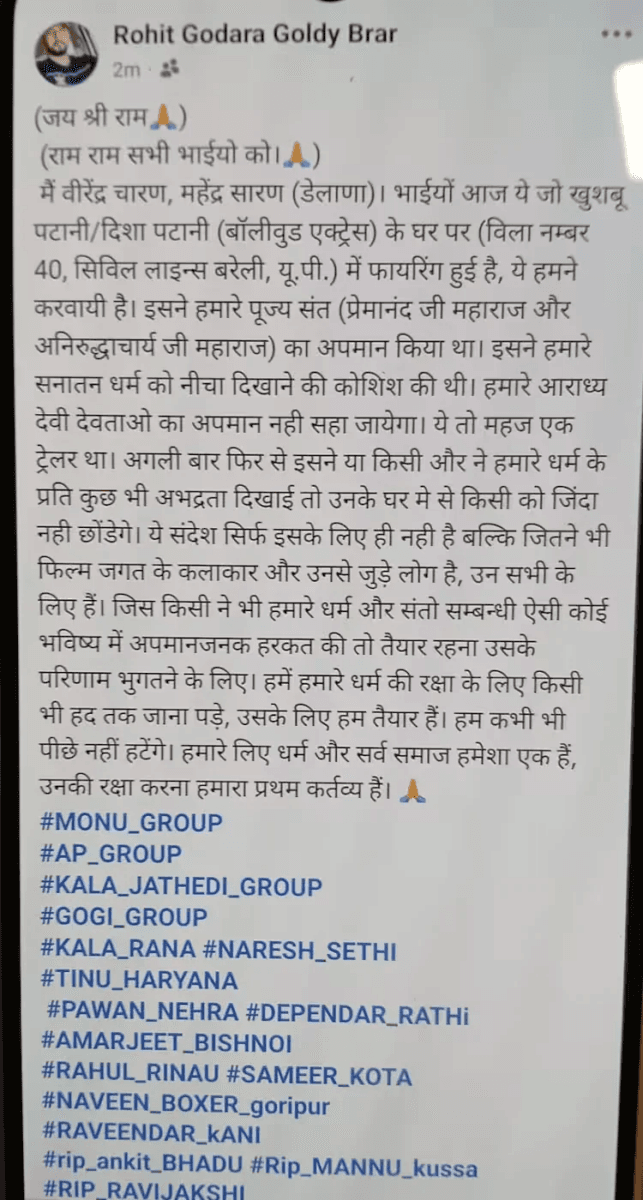 सोशल मीडिया फेसबुक पर किए गए एक पोस्ट में बरेली में हुई फायरिंग की जिम्मेदारी ली गई है. जिसके बाद पुलिस जांच में जुट गई है. यह पोस्ट हिंदी में लिखा गया था, जिसमें दो व्यक्तियों का नाम लेते हुए सीधे फिल्म इंडस्ट्री को चेतावनी दी गई है. फिलहाल पुलिस पोस्ट की सत्यता की जांच कर रही है. पोस्ट में लिखा हुआ है, मैं, वीरेंद्र चरण, महेंद्र सरन (डेलाना). भाइयों, आज खुशबू पाटनी/दिशा पाटनी (बॉलीवुड अभिनेत्री) के घर (विला नंबर 40, सिविल लाइंस, बरेली, उत्तर प्रदेश) पर जो गोलीबारी हुई, वो हमने करवाई है. उन्होंने हमारे पूज्य संतों (प्रेमानंद जी महाराज और अनिरुद्धाचार्य जी महाराज) का अपमान किया है. उन्होंने हमारे सनातन धर्म को नीचा दिखाने की कोशिश की. हमारे देवी-देवताओं का अपमान बर्दाश्त नहीं किया जाएगा. ये तो बस एक ट्रेलर था. अगली बार अगर उन्होंने या किसी और ने हमारे धर्म का अनादर किया, तो उनके घर में कोई भी जिंदा नहीं बचेगा.