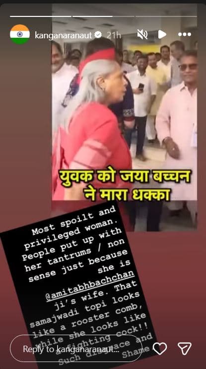 कंगना रनौत ने इंस्टाग्राम स्टोरीज पर एक वीडियो शेयर किया. जिसके कैप्शन में उन्होंने लिखा, “बिगड़ैल और विशेषाधिकार प्राप्त महिला… लोग उनके नखरे को सिर्फ इसलिए बर्दाशत करते हैं, क्योंकि वह @amitabhbachchan जी की पत्नी है. कितनी शर्मनाक बात है.” मामला तब शुरू हुआ, जब जया बच्चन ने अचानक सेल्फी ले रहे व्यक्ति को धक्का दे दिया. आसपास मौजूद हर कोई उन्हें देखने लगा.