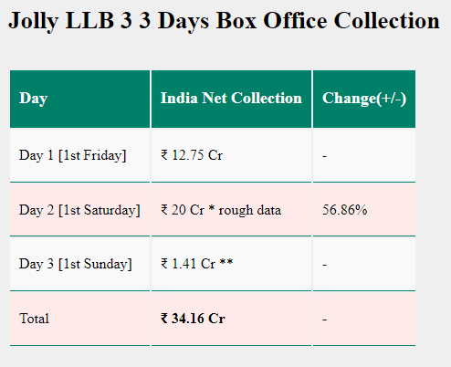 जॉली एलएलबी 3 के तीसरे दिन (सुबह 11 बजे तक) की शुरुआती रिपोर्ट्स के अनुसार, फिल्म ने 1.41 करोड़ रुपये कमाए. इसके साथ ही कुल कलेक्शन 34.16 करोड़ रुपये हो गया. हालांकि ये आंकड़े सुबह तक के हैं और शाम तक इसमें बदलाव हो सकता है.