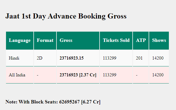 Sacnilk की फाइनल रिपोर्ट के अनुसार, शुक्रवार सुबह 6 बजे तक फिल्म के 10,308 शोज के लिए 1,20,463 टिकट बिक चुके थे, जिससे मूवी ने 3.23 करोड़ रुपये ग्रॉस कमाए. वहीं, ब्लॉक सीट्स मिलाकर यह आंकड़ा 6.37 करोड़ रुपये तक पहुंच गया. इस तरह फिल्म ने सनी देओल की ‘जाट’ (6.27 करोड़ ब्लॉक सीट्स सहित) को पीछे छोड़ दिया है.