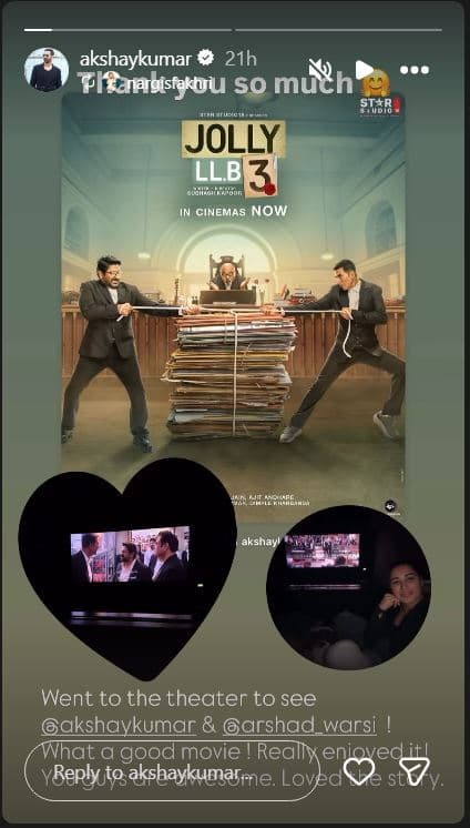 बॉलीवुड अभिनेत्री नरगिस फाकरी ने इंस्टाग्राम स्टोरी पर जॉली एलएलबी 3 का एक पोस्ट किया. जिसे अक्षय कुमार ने री पोस्ट किया. इसमें एक्ट्रेस ने लिखा, ”@अक्षय कुमार और @अरशद वारसी को देखने थिएटर गई… क्या अच्छी फिल्म है… मुझे बहुत मजा आया. आप लोग कमाल के हैं… फिल्म की कहानी भी बहुत अच्छी लगी.” एक्ट्रेस ने थियेटर्स से कुछ सेल्फी भी डाले. खिलाड़ी कुमार ने लिखा, ”थैंक्यू सो मच.”