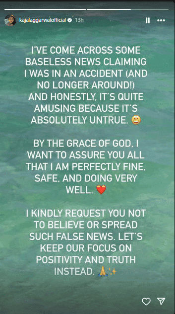 काजल ने अपनी पोस्ट में लिखा, “मुझे कुछ बेसलेस खबरें मिली हैं जिनमें कहा गया कि मैं हादसे का शिकार हो गई हूं (और अब जिंदा नहीं हूं). ईमानदारी से कहूं तो ये काफी मजेदार है क्योंकि ये पूरी तरह झूठ है. भगवान की कृपा से मैं बिल्कुल सुरक्षित हूं और अच्छा कर रही हूं. आप सबसे निवेदन है कि ऐसी फेक न्यूज पर भरोसा न करें और इन्हें फैलाएं भी नहीं. चलिए हम सब पॉजिटिविटी और सच्चाई पर फोकस करें.”