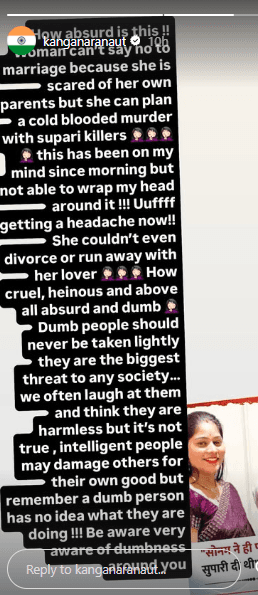 कंगना रनौत ने अपनों इंस्टाग्राम स्टोरी पर लिखा, “ये कितना अजीब है!! एक लड़की शादी से मना नहीं कर सकती क्योंकि वो अपने ही मां-बाप से डरती है, लेकिन वो सुपारी किलर्स के साथ मिलकर कोल्ड ब्लडेड मर्डर की प्लानिंग कर सकती है. सुबह से ये बात मेरे दिमाग में घूम रही है लेकिन समझ ही नहीं आ रहा!! उफ्फ्फ, अब तो सिरदर्द हो रहा है!! वो तलाक भी नहीं ले सकती या अपने प्रेमी के साथ भाग सकती.” आगे एक्ट्रेस लिखती है, कितना क्रूर, घिनौना और उससे भी ज्यादा बेवकूफी भरा है ये सब. बेवकूफ लोगों को कभी हल्के में नहीं लेना चाहिए. ये समाज के लिए सबसे बड़ा खतरा होते हैं. हम अक्सर उन पर हंसते हैं और सोचते हैं कि ये नुकसान नहीं पहुंचा सकते, लेकिन ऐसा नहीं है. समझदार इंसान कभी-कभी अपने फायदे के लिए दूसरों को नुकसान पहुंचा सकता है, लेकिन एक बेवकूफ इंसान को तो ये भी नहीं पता होता कि वो क्या कर रहा है. इसलिए अपने आसपास की बेवकूफी से सावधान रहें, बहुत सावधान.”