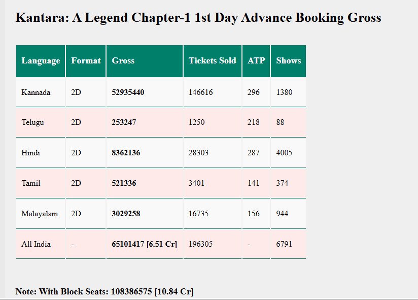 ‘कांतारा: चैप्टर 1’ की एडवांस बुकिंग चार दिन पहले शुरु हुई थी. Sacnilk की शुरुआती रिपोर्ट के मुताबिक, भारत में सुबह के 10 बजे तक फिल्म ने 6791 शोज के लिए टोटल सभी भाषाओं में 65101417 टिकट्स बेच लिए है. फिल्म का ग्रॉस कलेक्शन 6.51 करोड़ रुपये हो गया है. ब्लॉक सीट्स से लगभग मूवी ने अभी तक 10.84 करोड़ रुपये की कमाई कर ली. टिकटों की तेज ब्रिकी से पता चल रहा कि फिल्म की ओपनिंग काफी जबरदस्त होगी.