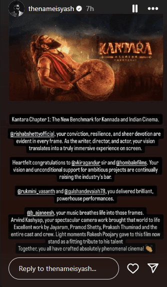 सुपरस्टार यश ने इंस्टाग्राम पर फिल्म का रिव्यू साझा करते हुए लिखा, “कांतारा चैप्टर 1 भारतीय सिनेमा के लिए एक नया मानक है. ऋषभ शेट्टी जी, आपकी मेहनत और समर्पण हर फ्रेम में साफ झलकता है. लेखक, निर्देशक और अभिनेता के रूप में आपकी दृष्टि पर्दे पर अद्भुत अनुभव देती है.”