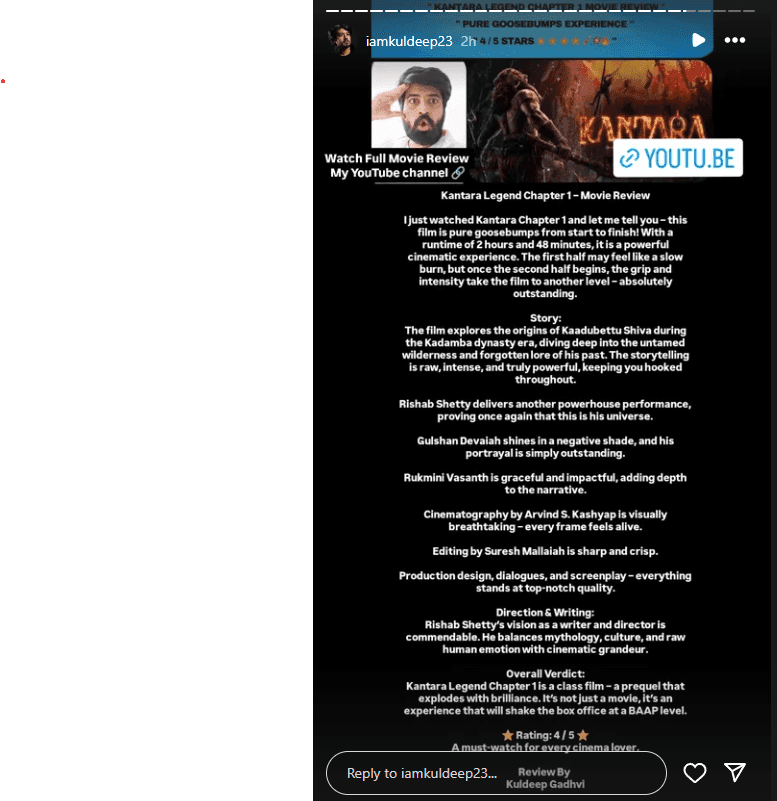 फिल्म क्रिटिक्स कुलदीप गढ़वी ने कंतारा चैप्टर 1 का पहला रिव्यू शेयर किया. उन्होंने इंस्टाग्राम स्टोरी पर फिल्म को लेकर बात की. उन्होंने कहा, मैंने अभी-अभी कंतारा चैप्टर 1 देखी और आपको बता दूं कि यह फिल्म शुरू से आखिरी तक पूरी तरह से रौंगटे खड़े कर देने वाली है. इसका रनटाइम 2 घंटे 48 मिनट का है. यह एक दमदार सिनेमाई अनुभव है. पहला पार्ट धीमा लग सकता है, लेकिन जैसे ही दूसरा पार्ट शुरू होता है, इसकी पकड़ और तीव्रता फिल्म को एक अलग ही लेवल पर ले जाती है, यह लाजवाब है. कुलदीप ने कंतारा चैप्टर 1 को 5 में से 4 रेटिंग दी है.