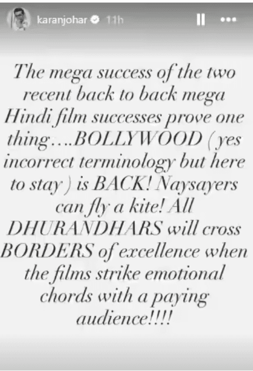 करण जौहर ने अपनी इंस्टाग्राम स्टोरी के जरिए दोनों फिल्मों की सफलता पर प्रतिक्रिया दी. उन्होंने लिखा कि लगातार दो बड़ी हिंदी फिल्मों की कामयाबी यह साबित करती है कि बॉलीवुड वापस लौट चुका है. करण के मुताबिक, जब फिल्में दर्शकों के दिल को छूती हैं, तो वे बॉक्स ऑफिस पर बड़ी सफलता हासिल करती हैं. उन्होंने आलोचकों पर भी तंज कसते हुए कहा कि नकारात्मक बातें करने वालों को अब चुप हो जाना चाहिए.