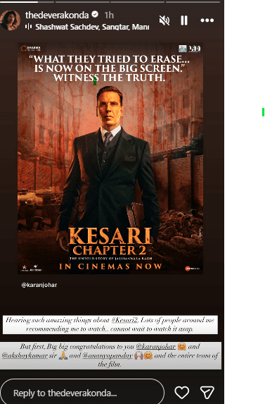विजय देवरकोंडा ने केसरी चैप्टर 2 की प्रशंसा की है और अपने इंस्टाग्राम स्टोरी पर फिल्म का पोस्टर शेयर किया है. उन्होंने इसके साथ लिखा कि फिल्म के बारे में बहुत अच्छी-अच्छी बातें सुन रहा हूं. मेरे आस-पास कई लोगों ने मुझे ये फिल्म देखने के लिए कहा. इसे जल्द से जल्द देखने का इंतजार नहीं कर सकता. लेकिन इससे पहले करण जौहर को बहुत-बहुत बधाई. साथ ही उन्होंने अक्षय कुमार और अनन्या पांडे को भी बधाई दी और उन्हें टैग किया.