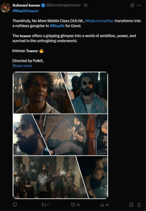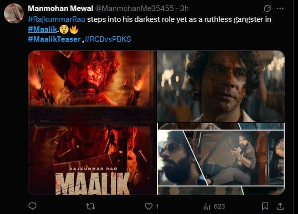 मालिक का टीजर देखकर एक यूजर ने लिखा, ”#MaalikTeaser… शुक्र है कि अब मध्यम वर्गीय दुल्हा नहीं #RajkummarRao एक क्रूर गैंगस्टर में बदल गया है. यह टीजर निर्मम अंडरवर्ल्ड में महत्वाकांक्षा, शक्ति और अस्तित्व की दुनिया की एक मनोरंजक झलक पेश करता है.” एक दूसरे यूजर ने लिखा, ”#राजकुमारराव #मालिक में एक क्रूर गैंगस्टर के रूप में अपनी अब तक की सबसे गहरी भूमिका में कदम रख रहे हैं.” एक अन्य यूजर ने लिखा, ”क्या टीजर है… ये मूवी जरूर ब्लॉकबस्टर ही होगी और पिछले सारे रिकॉर्ड तोड़ेगी.”