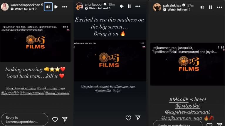 करीना कपूर खान ने इंस्टाग्राम स्टोरी पर लिखा, “अद्भुत लग रहे हो. टीम को शुभकामनाएं…” अर्जुन कपूर ने भी सोशल मीडिया पर लिखा, “बड़े पर्दे पर इस पागलपन को देखने के लिए उत्साहित हूं…इसे लाओ.” राजकुमार की पत्नी और अभिनेत्री पत्रलेखा ने कमेंट किया, “#मालिक यहाँ है और पति राजकुमार राय को टैग करते हुए आग और पटाखे वाला इमोटिकॉन जोड़ा.”