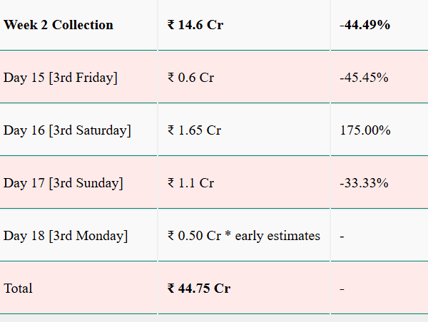 sacnilk की रिपोर्ट के मुताबिक फिल्म ने 18 वें दिन करीब 0.50 करोड़ रुपये का नेट कलेक्शन किया है. इसके साथ ही फिल्म का कुल नेट कलेक्शन 44.75 करोड़ तक पहुंच गया है. तीसरे सोमवार को ऑक्यूपेंसी 9 प्रतिशत के आसपास रही, जो बताती है कि दर्शकों की दिलचस्पी अब भी बनी हुई है, भले ही भीड़ पहले जैसी न हो.