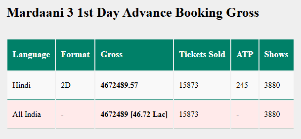 2019 में रिलीज हुई मर्दानी 2 ने बॉक्स ऑफिस पर पहले दिन ₹3.80 करोड़ की ओपनिंग ली थी. लगभग ₹30 करोड़ के बजट में बनी इस फिल्म ने वर्ल्डवाइड करीब ₹40 करोड़ का कलेक्शन किया था. इसके मुकाबले मर्दानी 3 की शुरुआती एडवांस बुकिंग काफी कमजोर मानी जा रही है, जिससे फिल्म की ओपनिंग को लेकर सवाल खड़े हो रहे हैं.