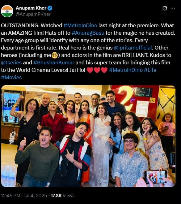 अनुपम खेर ने मेट्रो…इन डिनो की टीम के साथ एक्स पर एक तस्वीर साझा की. उन्होंने फिल्म की समीक्षा साझा की और इसे बेहतरीन बताया. एक्टर ने लिखा, “उत्कृष्ट: स्पेशल प्रीमियर पर #MetroInDino देखी… क्या अद्भुत फिल्म है! उन्होंने जो जादू रचा है, उसके लिए #AnuragBasu को सलाम. हर आयु वर्ग किसी भी कहानी से खुद को जोड़ पाएगा. हर विभाग प्रथम श्रेणी का है. असली हीरो जीनियस @ipritamofficial है. फिल्म में अन्य हीरो मेरे साथी हैं. इस फिल्म को विश्व सिनेमा प्रेमियों तक पहुंचाने के लिए @tseries और #BhushanKumar और उनकी बेहतरीन टीम को बधाई! जय हो! #MetroInDino #Life #Movies.”