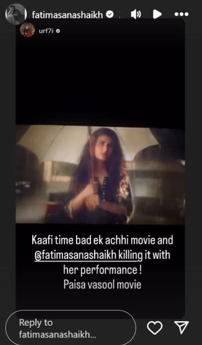 उर्फी जावेद ने अपनी इंस्टाग्राम स्टोरीज पर फिल्म का एक सीन शेयर करते हुए लिखा, “काफी समय बाद एक अच्छी फिल्म और @fatimasanashaikh ने अपने परफॉर्मेंस से कमाल कर दिया! पैसा वसूल फिल्म.” फातिमा ने भी अपने इंस्टाग्राम पर इस नोट को री पोस्ट किया. इस मल्टी-स्टारर फिल्म में आदित्य रॉय कपूर, सारा अली खान, अली फजल, नीना गुप्ता, कोंकणा सेन शर्मा, पंकज त्रिपाठी और अनुपम खेर जैसे सितारे हैं.